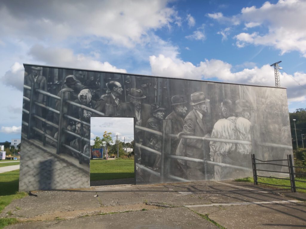 Am Deportationsmahnmal am Schlachthof endete unser Rundgang. Die ehemalige Viehverladerampe erinnert an die großangelegten Deportationen 1942. Die Wiesbadener Jüdinnen und Juden wurden über Frankfurt nach Theresienstadt verschleppt, viele von ihnen starben in Theresienstadt, viele wurden weiter nach Auschwitz und Treblinka verschleppt und ermordet, nur wenige überlebten. Die Fotoserie, die dem Graffiti des Mahnmals als Vorlage diente, dokumentiert die Registrierung der Wiesbadener Jüdinnen und Juden im Gemeinderaum der Synagoge bis zum Einstieg in die Züge an der Viehverladerampe. Frau Lukat machte uns auf Details auf den Fotos aufmerksam, u.a. dass nicht nur die Gestapo, sondern auch die Polizei, die damals dem Oberbürgermeister unterstand, die Deportation überwachten.