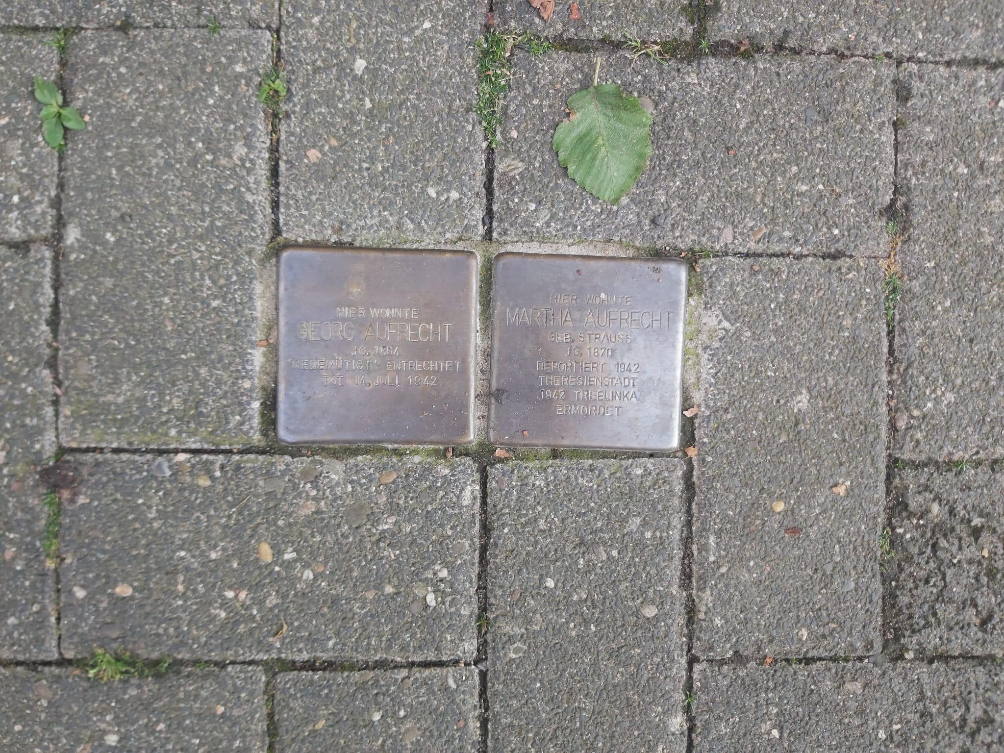 In der Matthias-Claudius-Straße legten wir einen Stopp an den Stolpersteinen für Martha (geb.1870, deportiert am 1.09.42, ermordet 1942 in Treblinka) und Georg Aufrecht (1864 – Juli 1942) ein. Georg Aufrecht, im Weinhandel tätig, gehörte zu den sogenannten „Aktionsjuden“, die im Zuge der Novemberpogrome 1938 verhaftet und in Konzentrationslager verschleppt wurden. Ziel des NS-Regimes war es, die deutschen Jüdinnen und Juden durch Gewalt und Terror zur Auswanderung zu zwingen.