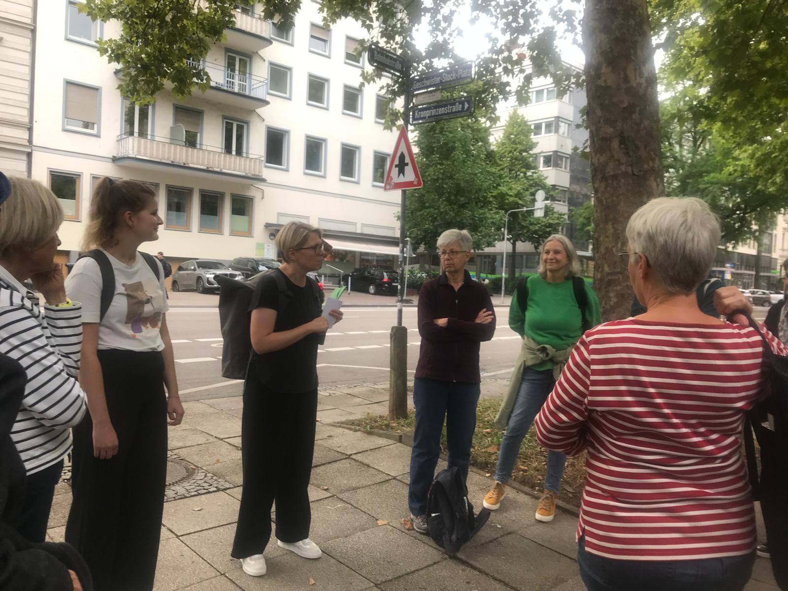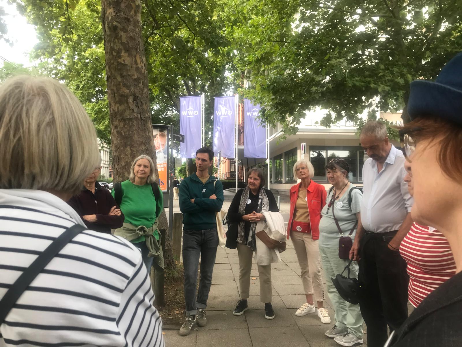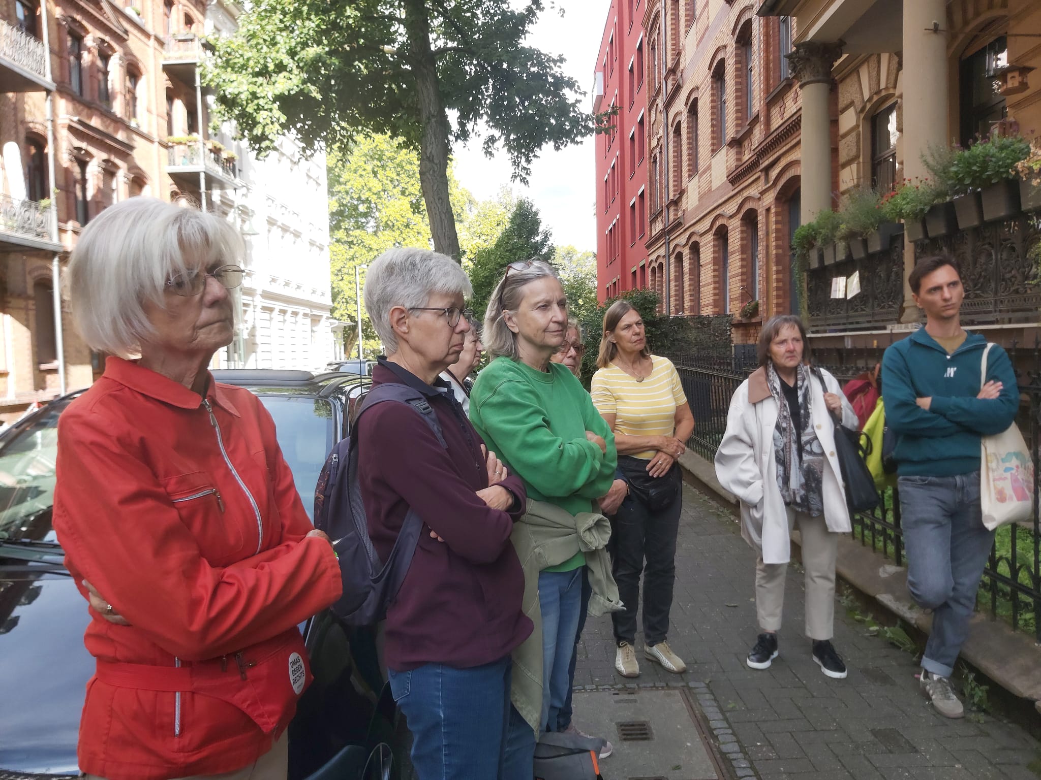 Mit Dr. Katherine Lukat, Sachgebietsleiterin für Gedenkstätten und Stadtgeschichte im Stadtarchiv Wiesbaden suchten die OMAS GEGEN RECHTS Wiesbaden am 1. September 2025 verschiedene Erinnerungsorte zur Ausgrenzung und Deportation der Wiesbadener Jüdinnen und Juden in der NS-Zeit auf.